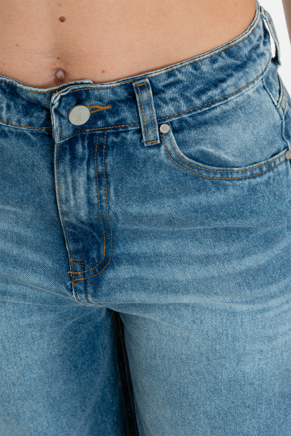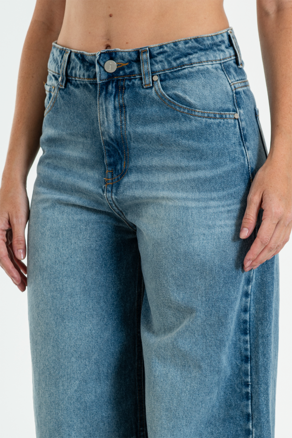 100% algodón. Baggy tiro alto calce relaxed Clásico. Detalle de pinzas en entrepierna altura rodilla y ruedo. Ruedo clásico. Cierre YKK. Botón y tachas zamak.