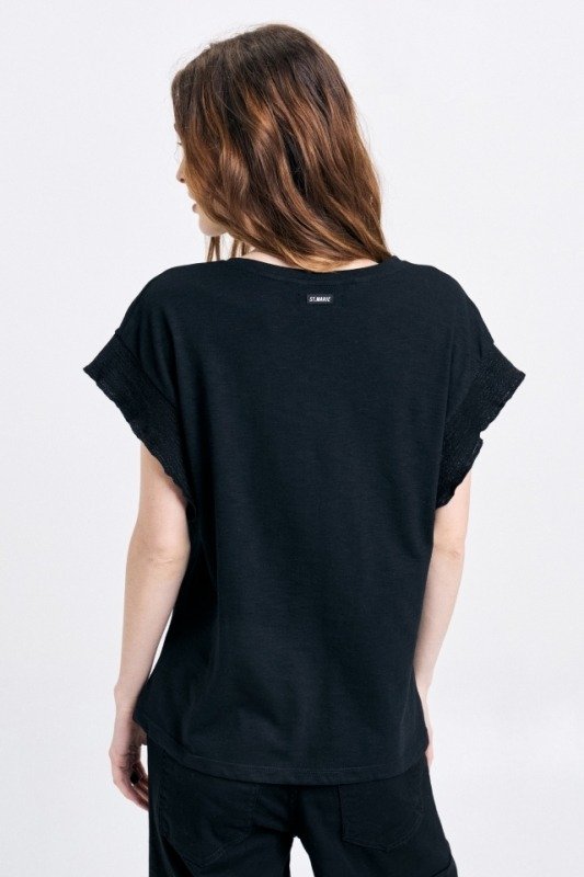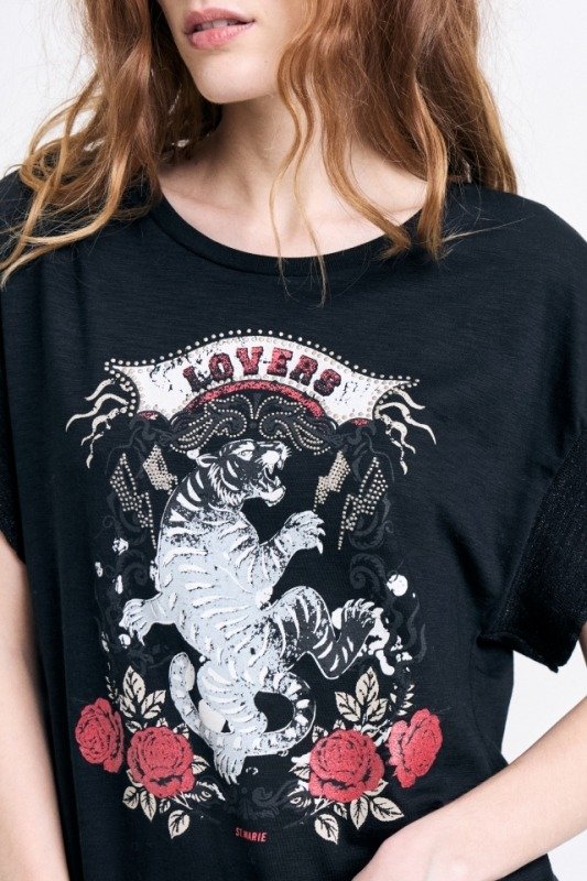 Remera en jersey flamé con estampa "Lovers". Terminación de mangas volante con tiras tejidas en lúrex